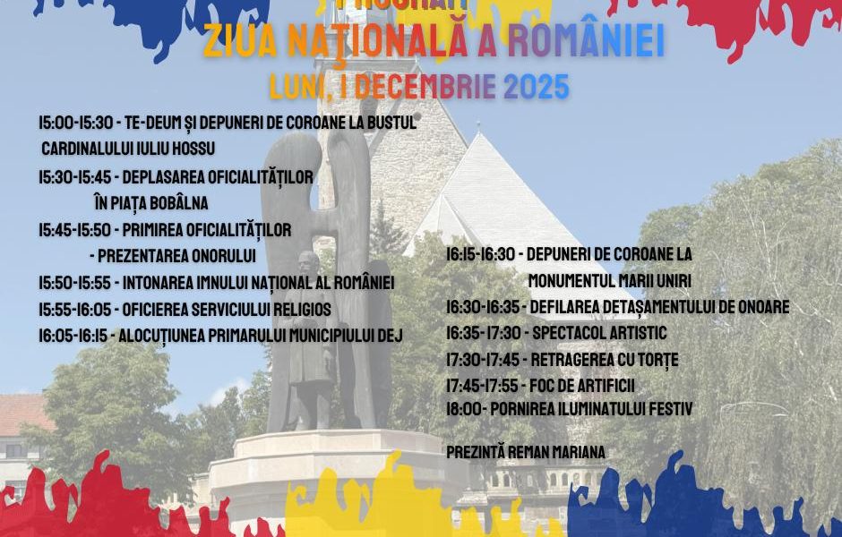 Primăria Municipiului Dej în colaborare cu Garnizoana Dej organizează luni, 1 Decembrie, manifestări dedicate ZILEI NAŢIONALE a ROMÂNIEI. Activităţile vor debuta în jurul orei 15:00 prin...