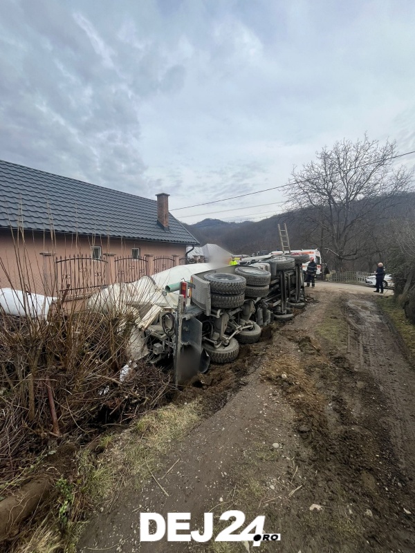 Din primele informații, o autobasculantă s-a răsturnat în afara părții carosabile. În urma apelului la 112, la fața locului au intervenit de urgență pompierii din cadrul Detașamentului de Pompieri Dej, o ambulanță, dar și polițiștii.