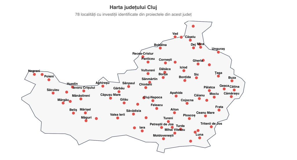 Conform datelor oficiale de pe platformă, comuna Jichișu de Jos este singura localitate din județul Cluj care figurează fără niciun proiect depus prin PNRR.