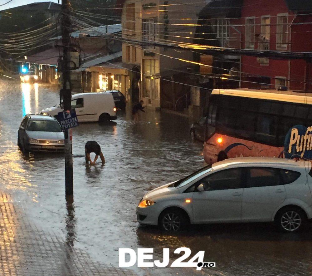 Ploaia torențială căzută în această seară la Dej a dat serioase bătăi de cap șoferilor și pietonilor aflați pe stradă.