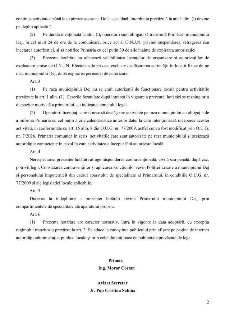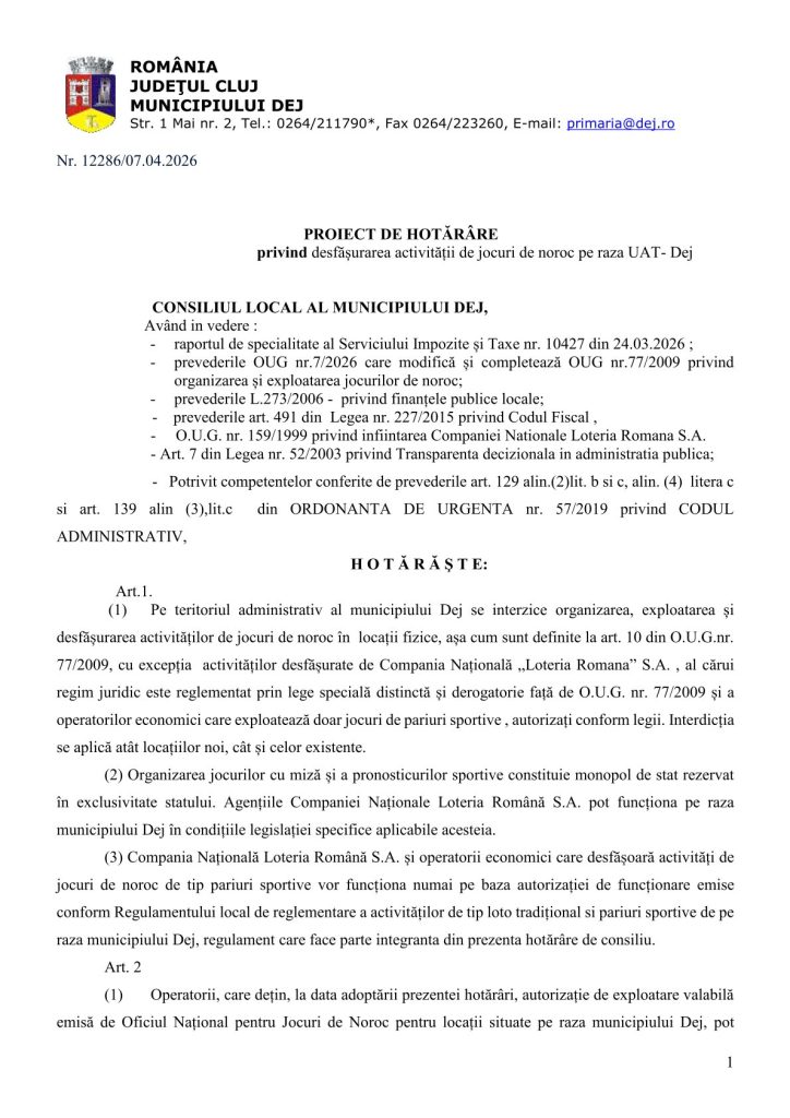 Primăria Municipiului Dej a lansat în consultare publică Proiectul de Hotărâre privind desfășurarea activității de jocuri de noroc pe raza UAT- Dej, respectiv ,,interzicerea organizării, exploatării și desfășurării activităților de jocuri de noroc în locații fizice, așa cum sunt definite la art. 10 din O.U.G. nr. 77/2009, cu excepția activităților desfășurate de Compania Națională „Loteria Romana” S.A. , al cărui regim juridic este reglementat prin lege specială distinctă și derogatorie față de O.U.G. nr. 77/2009 și a operatorilor economici care exploatează doar jocuri de pariuri sportive, autorizați conform legii. Interdicția se aplică atât locațiilor noi, cât și celor existente.”
