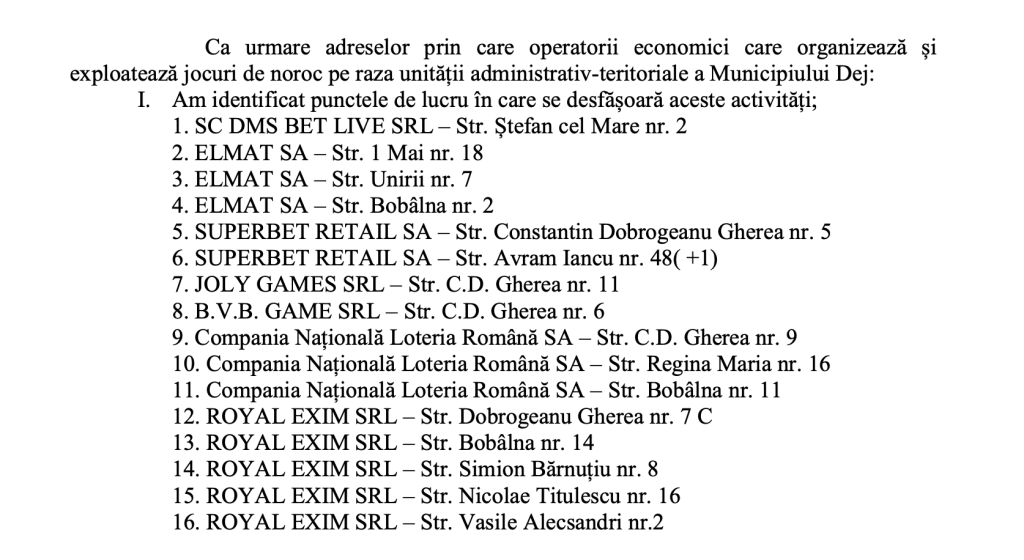 Astfel, conform Raportului de specialitate al Serviciului Impozite și Taxe, pe raza municipiului Dej funcționează în prezent 16 puncte de lucru în care se desfășoară jocuri de noroc.