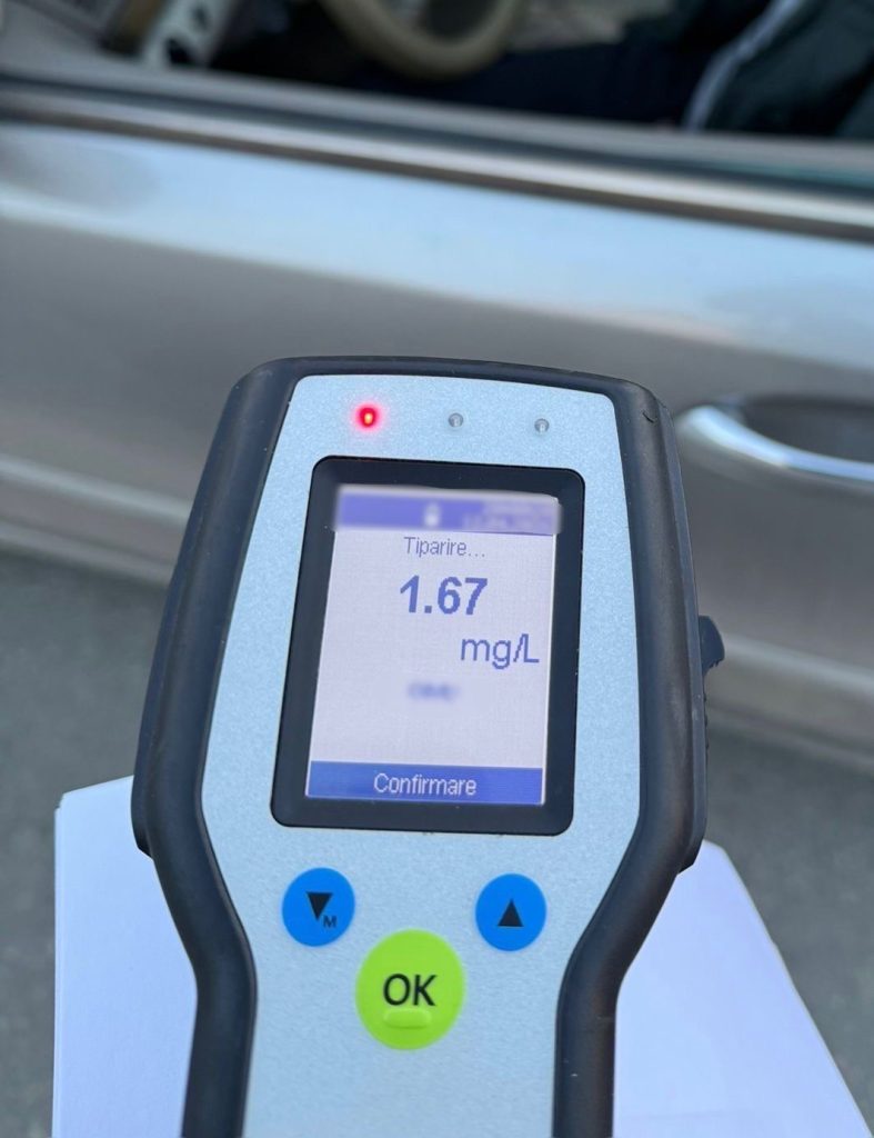 În urma testării cu aparatul etilotest, a rezultat o concentrație de 1,67 mg/l alcool pur în aerul expirat, conducătorul auto fiind ulterior condus la o unitate medicală pentru recoltarea de probe biologice, în vederea stabilirii alcoolemiei.