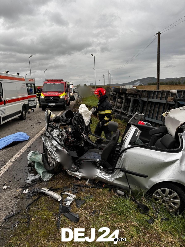Din primele informații, în accident au fost implicate un autovehicul și un ansamblu de vehicule (autotren). În urma apelului la 112, la fața locului intervin de urgență două ambulanțe, pompierii din cadrul Detașamentului de Pompieri Dej cu două autospeciale cu modul de descarcerare, dar și polițiștii.