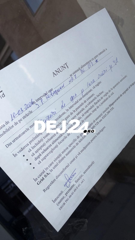 ”Scăpări de gaz pe casa scării” – a fost motivul precizat de cei de la Delgaz Grid, pe afișul lipit pe ușa de la intrare în bloc.
